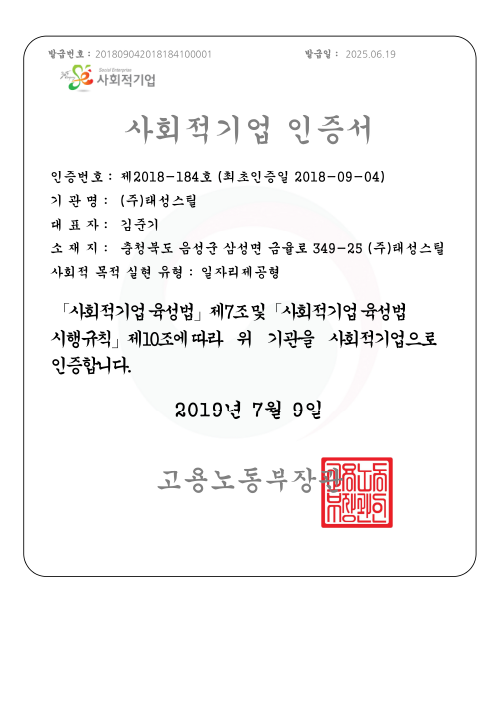사회적기업인증서
